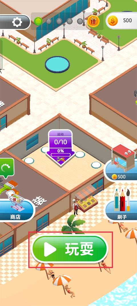 1、游戏的开始是开设一个关于运动方面的店铺,当后期解锁的物品越多,就能解锁新的店铺,点击“玩耍”。